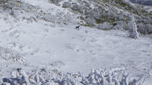 雪の峠で大きな獣が動く気配を感じて目を凝らすと、突然の人間の出現に驚いたのか、ニホンジカがこちらの様子をうかがっていました。でも雪が深すぎて思うように逃げられずパニック気味のようです。昨年大平湿原の水芭蕉をすべて食い荒らした張本人かもしれません。近年ニホンジカの食害が環境問題として騒がれるようになってきていますが、私たちの間でもニホンジカとどう向き合いながら共生していかなければならないか深刻な問題となっています。
