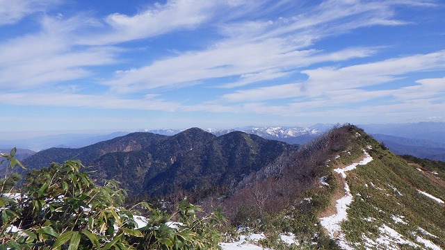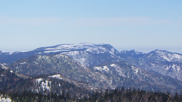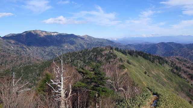 今度は反対方向のぐんま県境稜線トレイルの山々です。野反湖から志賀高原へと続いていく稜線の山々は、うねうねと曲がりくねって連なっています。何度も歩いた人でないと写真からコースを辿るのは至難です。