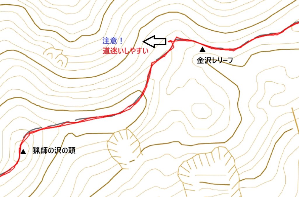 ところで、白砂山からの下山時に、積雪期限定で道迷いしやすい場所があります。金沢レリーフを過ぎてすぐのところです。