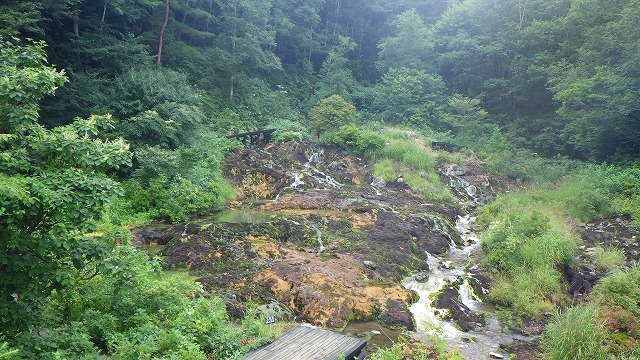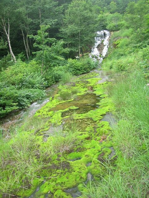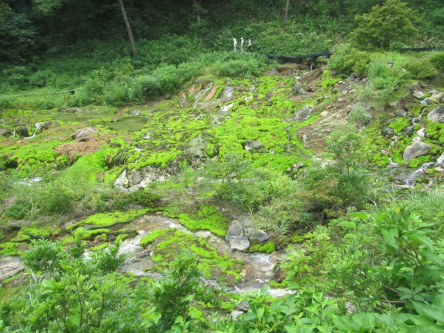上の写真は、2017年8月2日の湯滝下のチャツボミゴケ河原です。穴地獄も同様に素晴らしいチャツボミゴケグリーンに輝いていました。