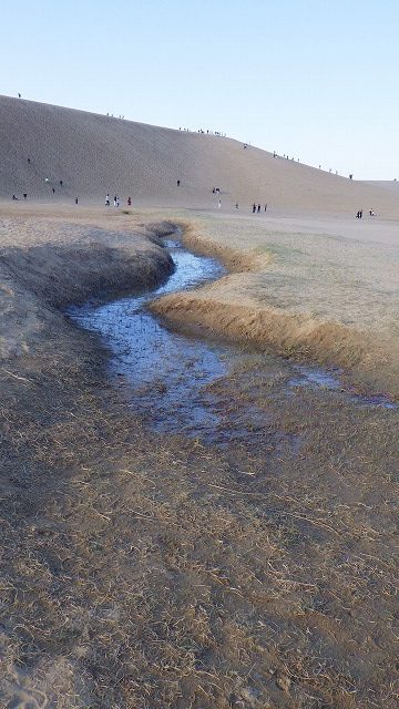 帰りは砂漠のオアシスみたいな水が流れているところを寄り道してみました。砂漠のような砂丘でも水際には草が生えていたりして、なるほどこれもオアシスです。