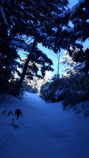 西日本の日本海側でも積もるような大寒波が過ぎて、今日は移動性高気圧に覆われて小春日和のうららかな日に恵まれそうです。朝のうちはまだ放射冷却で極寒ですが、昼近くになれば暖かくなりそうです。針葉樹の森では根曲竹の薮がまだ埋まりきりませんが、フレッシュなフカフカの雪がたくさん積もっていました。