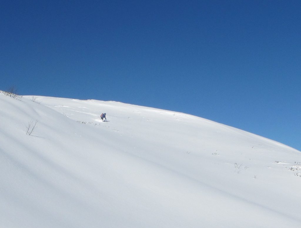 斜度もまずまずなので気持ちよくテレマークターンの感覚を味わえました。シールを貼りなおしてもう一本です。