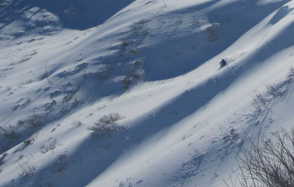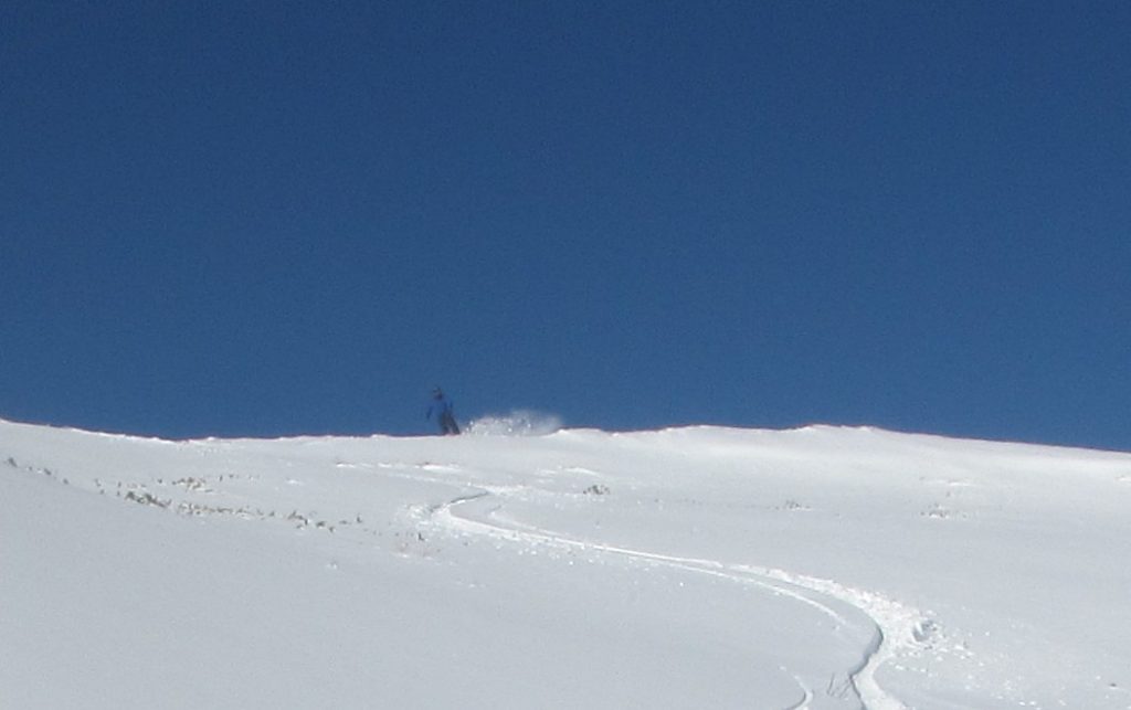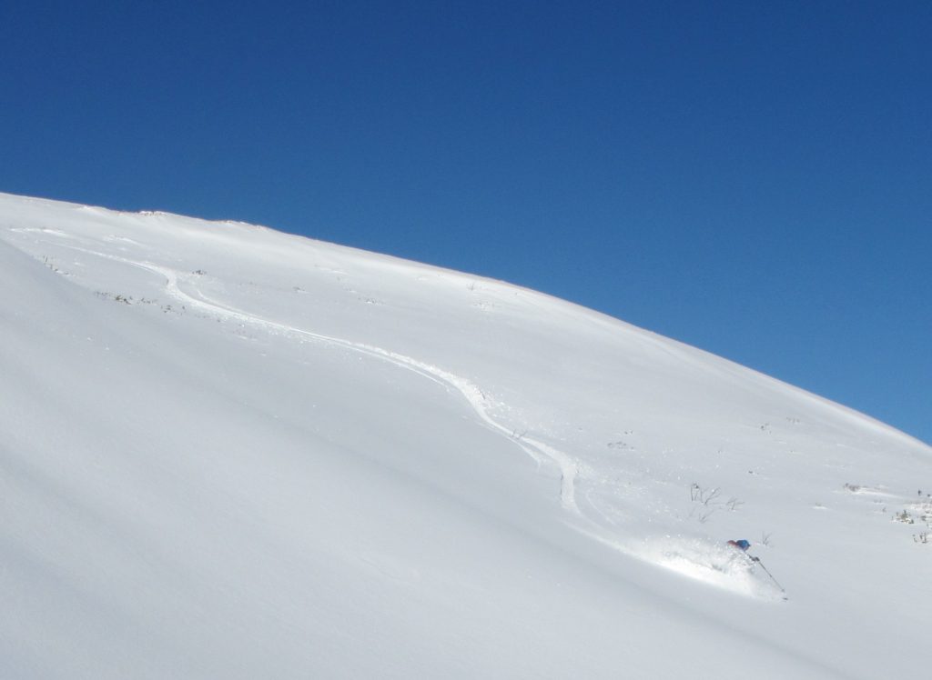 風裏の斜面は雪が吹き溜まります。雪崩の名所にもなりますが、この時期なら安心して飛び込めます。