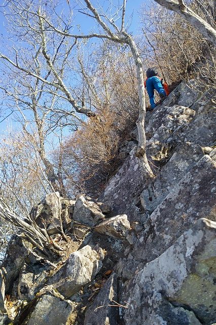 今度は高ジョッキに登ってみます。丸岩よりも少し長くて岩場っぽいところもあるルートですが、こちらも初冬の低山ハイクにはもってこいの山です。登り始めは森の中の急坂ですが、新三角点からは細い稜線歩きになります。登山道がはっきりしない岩稜帯などではルートが間違えやすいところもあるので、落ち着いて目印などを確認しながら歩くと安心です。