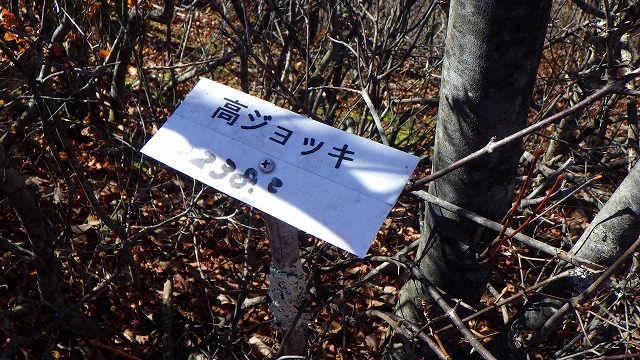 といっても登山道はガレ場が続く箇所があるので油断禁物です。中間地点に来ると視界が少し開けて、高ジョッキが樹林越しに見えます。ここから急坂になり落ち葉で滑りやすくなります。登山道も不明瞭で古い目印のテープなどが見つかると安心できます。頑張って登り上げると山頂です。