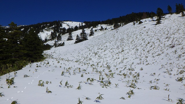 雪はよく締まってきていますが、笹薮や低木をよけたりするのに冷や冷やしながら滑る場面もありました。
