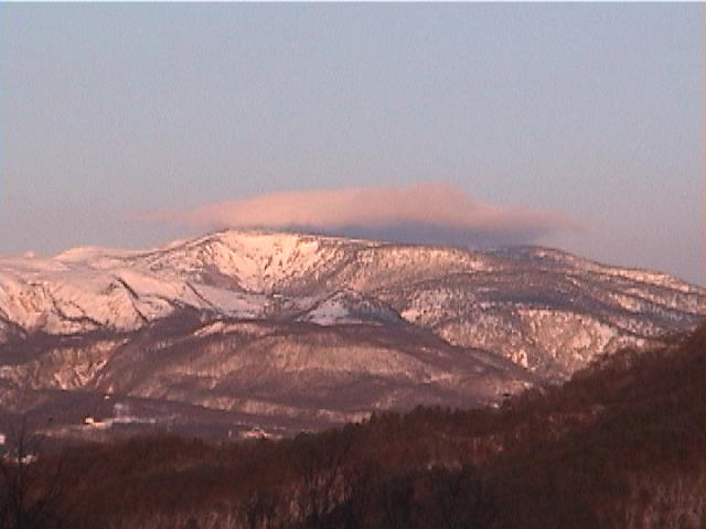 耳を澄ましてみてもまだ渋峠スキー場のリフトの音は聞こえてこない。このあたりにくると、なぜか登りの疲れも出てきて早く聞こえてこないかとリフトの音が恋しくなるのだ。すると、いきなり渋峠と芳ヶ平を結ぶ登山道に出くわした。耳を澄ますと、横手山スキー場のリフトの音も聞こえてきた。そちらに進路をとろうかとも思ったが、ガスも濃くなってきているし、直接池ノ塔山を目指すことにした。しばらくして志賀草津道路も横断し、なおもなだらかな斜面を歩いていくと山頂らしきところに着いた。12時30分ジャスト。標柱もないので、どこだかわからないと思うが一応セルフタイマーで写真を撮って、テルモスのコーヒーをすすり、早々に芳ヶ平へ滑降することにした。