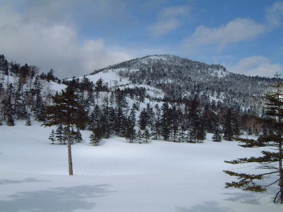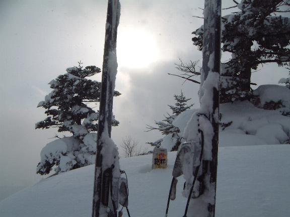 山頂直下には、セッピのできる急傾斜の片斜面があるので、うまく山頂にはい上がれるか心配だった。しかし、セッピは発達してなくて、いつもよりずっと緩やかな斜面だったので驚いた。わりあい楽に通過して、念願の山頂に立った。たった一人の実働6時間半のラッセルだった。腰が痛~い。