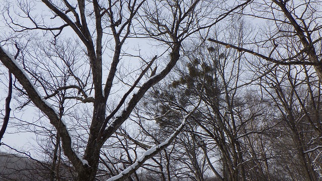 昨日は暖かったようですが、今日は冬型で気温も上がらなさそう。北風も朝からけっこう強く吹いています。雪の積もり具合をいつものように偵察です。途中でヤドリギの多さにびっくりの木を発見。周りの木はほとんどヤドリギがないのに、この木だけ。樹皮の模様からミズキやコシアブラと似ていましたが、ブナと同定しました。しかしながら、どうしてこの木だけこんな風になるのか面白いです。