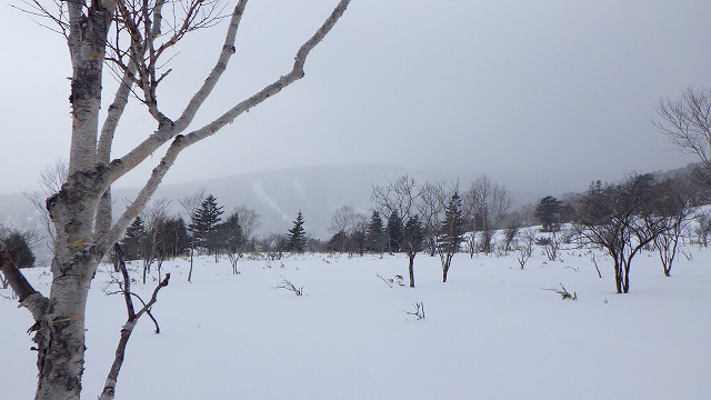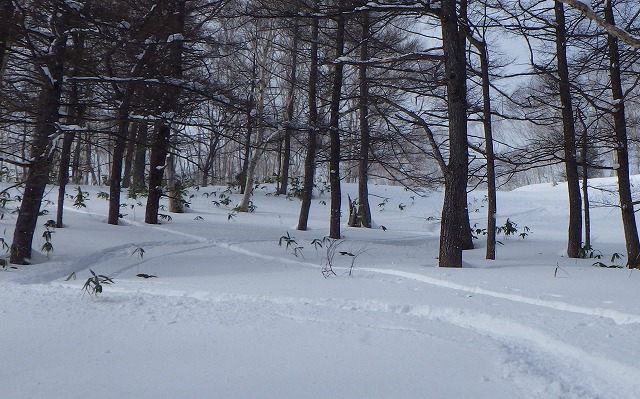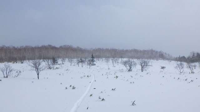 1600m台地に上がると風がいっそう強くなり地吹雪っぽくなってきました。帰りはもちろんトレースが消えていて、ちょこっと方向を間違って滑ってしまいました。