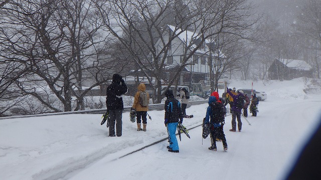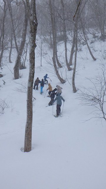 寒さに負けず、スノーシューのかけっこ大会などをしたり、急斜面を尻セードしたりして、いい大人の面々が童心にかえって雪と戯れました。途中でガイドさんからいただいた暖かいカップコーヒーはやっぱりありがたいですね。下山後は出発地の谷川岳ドライブインでこれまた温かい昼食で大満足でした。