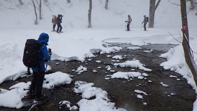 湯檜曽川もまだ流れがいたるところで顔を出していましたが、やがて雪に埋もれます。スノーシューでジャブジャブ渡って、奥へ奥へと進むんでいくと広い雪原に出ました。晴れていれば、馬蹄形に囲む谷川の山々を仰ぎ見ることのできる絶景ポイントだそうです。