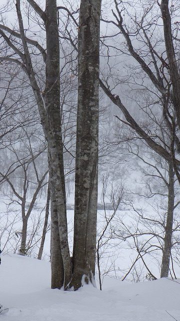 みなかみの山は、中之条町の山と違って雪国の雰囲気がプンプン漂っていました。その特徴はやはり、湯檜曽川沿いの河畔林がブナの原生林というところです。これくらいのブナの木で樹齢200年だそうです。古いクマの爪痕がたくさん残されていました。今年はドングリが不作の年だったので、もちろんどの木にも熊棚はまったく見つけられません。12月になっても、町中でのクマの出没ニュースが多かったのは、ドングリの不作が原因だったことが納得できます。