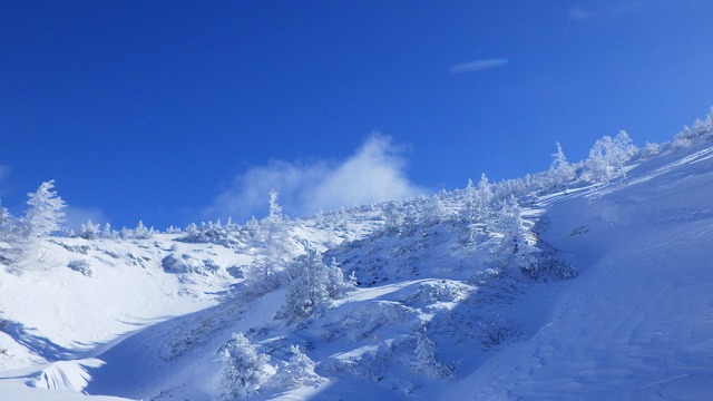 それにしても気温が低くて寒かったです。だからフカフカのパウダーを期待しました。ところが大きな雪庇も出来てないし、思ったよりも軽いパウダーではなく風で痛めつけられた重いパウダーです。ただ雪崩リスクが少ないので少し安心でした。