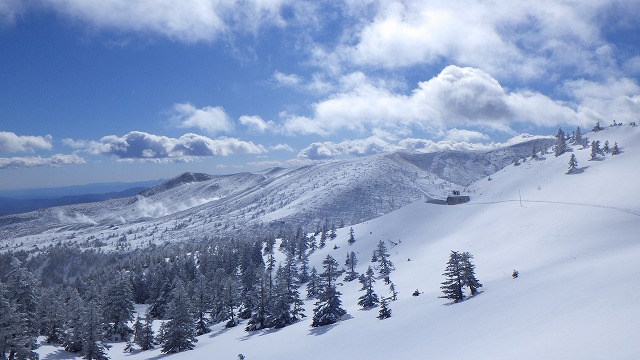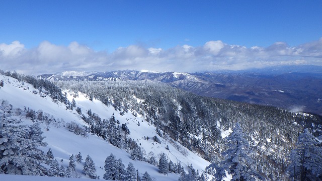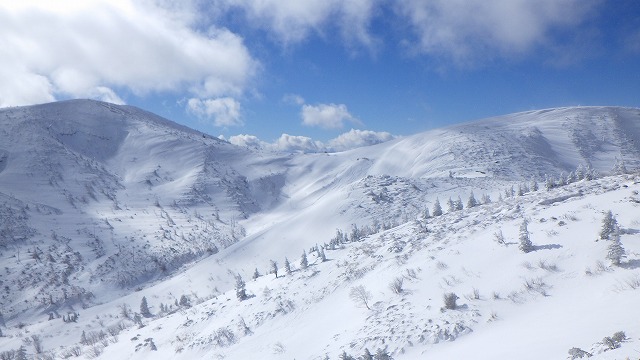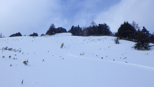 白砂山が遠くから微笑んでいます。いよいよここから標高差1000m以上の長い滑降コースが始まります。変化にとんだ尾根コースをまずは芳ヶ平湿原まで一気に滑りました。まだ誰も滑ったシュプールがなくて、自由気ままにスキーを走らせました。