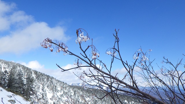 途中見つけた綺麗な木の花。マイナス10度の世界で、山桜の花が狂い咲きかと思うほどの出来事でした。でもよく見ると、熟し残ったナナカマドの実が樹氷として残っている自然のオブジェでした。