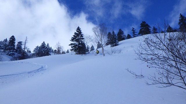 標高1800mになっても気温が低くて雪は腐らず、オムスビ山も大きなターンで自由気ままなシュプールを描くことができました。
