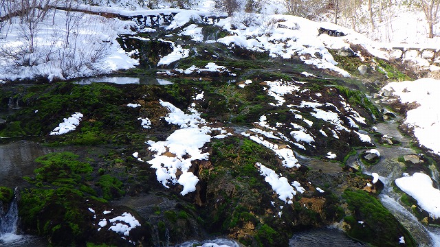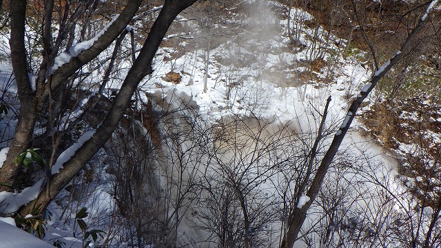 朝の気温はマイナス10度以下でしたが、陽射しがあると温かく感じられます。温泉大滝や湯滝からは、湯気がモクモクと立ち昇っていました。