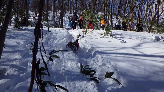 雪面に残された動物の足跡やミズキの木にたくさん残された熊棚の痕などを観察しながら歩きました。下山はお待ちかね、尻セードです。皆さん夢中で滑りを楽しんでいました。たっぷり遊んで、下山後アツアツのカップ麺のランチは、きっと忘れられない味になったことでしょう。