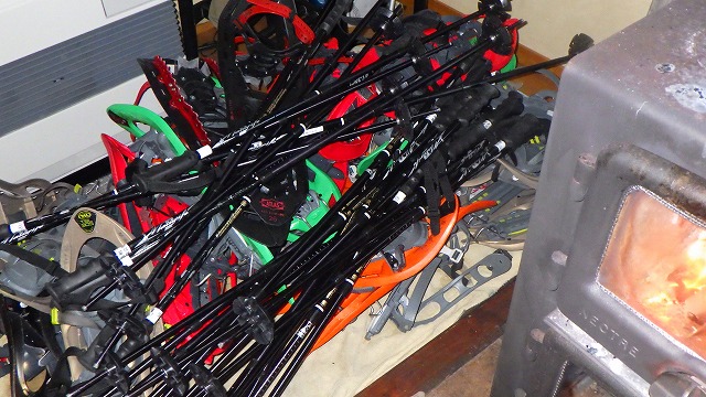 本日の16人分のスノーシューです。きれいに洗って薪ストーブの横で乾かします。次回のためにしっかり点検して手入れをしておかなければです。