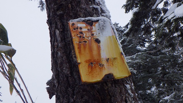 いつもはトレースをつけないルートでハイクアップすると、古いツアー看板を発見できました。ニッカウヰスキーと書かれていました。登山者のザックにはウイスキーのスキットルが忍ばせてあった昭和の時代のスキーツアーの様子が思い浮かびます。