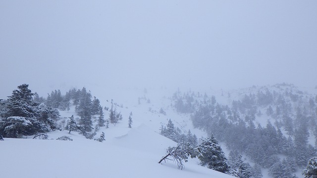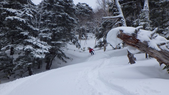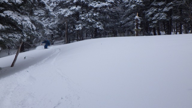 ところで、下界は雨か湿雪でしたが、山はパウダーに恵まれました。ただし山頂付近は霧が巻いて視界が利かないようだったので、針葉樹の森の中をガイドしました。