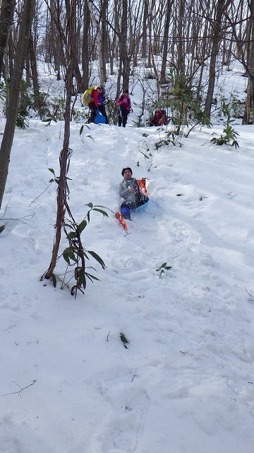 温かいカップ麺ランチを食べながらお話が弾みます。下山はこれまたいつものようにソリ遊びをしながらです。今日の雪質は尻セードでも非常に良く滑ってスリリングでした。