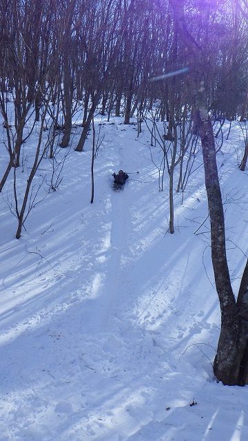 日向道の雪は前回のツアーの時よりも融けて少なくなっていましたが、日陰の斜面にはまだまだパウダーな雪がたっぷりと残っています。ソリ遊びや尻セードも童心にかえって楽しみました。カップ麺ランチも美味しかったです。
