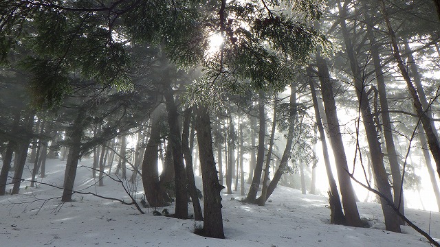 雨上がりの朝の雪山です。水滴を纏ったコメツガの葉がキラキラと輝いていました。冬ではなくもう春がやって来たんだと実感してしまいます。