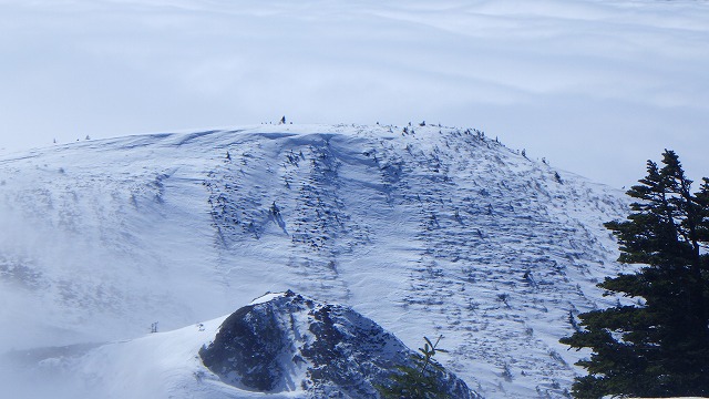 芳ヶ平湿地群は雲海の下に沈んで濃い霧の中でした。標高2217mの池の塔山を目指します。雪はもう完全にザラメ化していました。最初の登りはシールを使いましたが、その後はもう必要なくなりました。うろこが良く効いてシールの出番は無しでした。