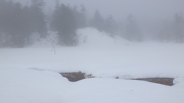 快適なザラメ滑降を期待して下山しました。残念ながら芳ヶ平湿地群は雲海に沈んだままでした。湿原では雪解けがどんどん進んでいました。池塘の氷が割れることはないでしょうが、コースどりも慎重になりました。土地勘があるので古いトレースを頼りに進めますが、初めて訪れる人はさ迷い歩くことになるでしょう。
