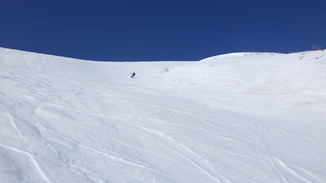 1本目は、まだ緩んでいませんでしたが、沢筋にほんのちょっぴり新雪が積もっていたのでターンが楽しめました。