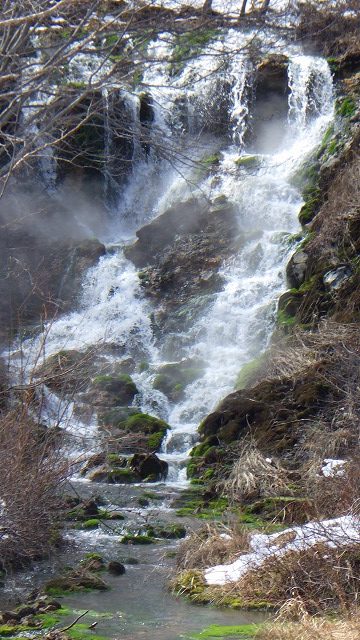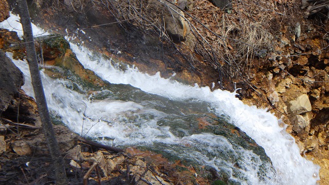 ほとばしる温泉大滝の滝口では、チャツボミゴケが懸命にしがみついて成長している姿がわかります。