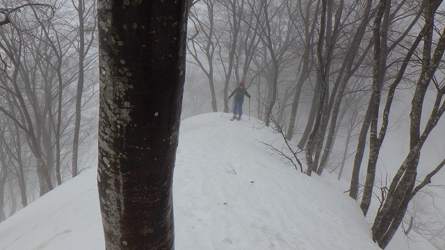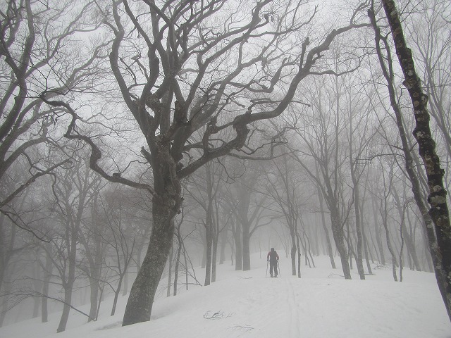 標高を上げると霧に巻かれ始めました。尾根の取りつきは急斜面で、スキーアイゼンが役立ちました。雨に濡れたブナの幹も美しいです。