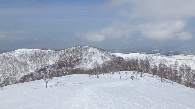 山頂直下まで登ってくると、東尾根と南尾根が合わさって、緩やかなブナ林の斜面が気持ちよく広がっていました。今日のザラメ雪なら、気ままにテレマークターンを描いて楽しく滑れそうです。ゆっくりとハイクアップして、正午過ぎに名前通りなべ底をひっくり返した広場のような山頂に到着しました。
