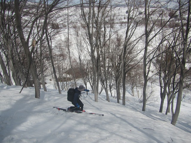 午後を過ぎるとザラメ雪は急速に柔らかく融け始めているようでした。登りの時間帯のコンディションが気持ち良い滑りを堪能できたようです。下るほどにシャバシャバした腐れ雪になっていきますが、春のバックカントリースキーはピクニック気分で楽しめるのがやっぱりいいですね。
