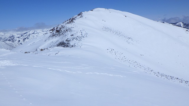 先行者が4人いて、皆さん小至仏山ピークにいったん登っていたので、無理してトラバースせず後を追います。至仏山との鞍部への下りは、シールのまま降りました。今回はウロコ板でなかったのでちょっと後悔です。春山のBCは、やっぱりウロコかな・・・