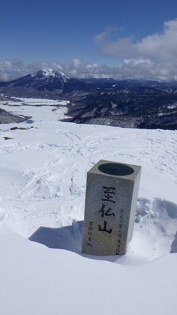 先行者はすでに下山したようで、至仏山山頂には誰もいなくて私一人でした。山名標柱はまったく埋もれていなくて、今年の残雪の少なさを実感しました。でも雪はフラットな感じで綺麗に積っていて、少ないなりにいい感じかなという印象です。もちろんまだ縦溝もありません。