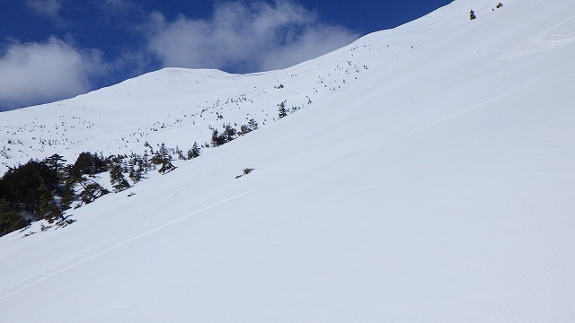 ところが良く滑る雪も、ワル沢下部のボトム尾根に滑り込んだくらいからストップ雪になってつんのめりそうになりました。やはり今日は午前中の速攻BCが結果的にラッキーだったようです。のんびり登っていたら、ワル沢の大斜面もストップ雪に苦しまなければならなかったかも。