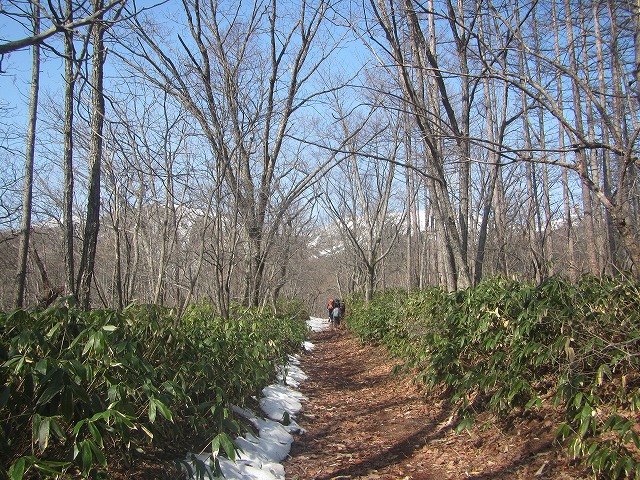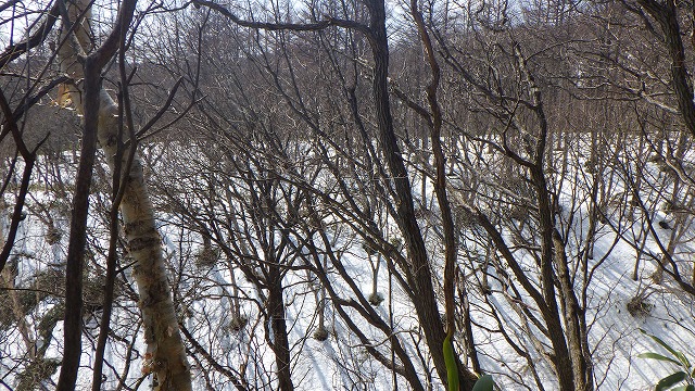 今年は残雪がとても少なくて、登山道の入り口からスノーシューを履いてスタート出来ません。蟻の戸渡までは行きも帰りもトレッキングでした。でも天気に恵まれて、気持ち良い春の風を全身に感じながら歩けました。古い山の神の石碑がある大楢の木まで登ってくると、正面に入道沢を挟んで白根隠し山(右)と青葉山(左)が梢越に現れてきます。