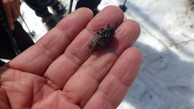 フキノトウがたくさんあるところを見つけました。春の息吹をいたるところで感じることができる一日でした。季節のズレの痕跡もありました。せみの死骸です。大きさから、この辺りの森で初夏の頃に大合唱するエゾハルゼミのようです。でも3月下旬の雪の上でなぜこのような姿で見つかるのか? 自然はわからないことがいっぱいです。
