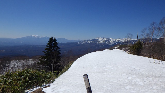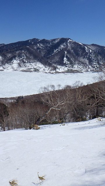 エビの見晴らし台に着きました。雪の固いところもありましたが、前夜少し新雪が積もったところもあって、ウロコで快調に登ってきました。例年なら大きな雪庇が野反湖側に張り出しているのに、今年は笹薮です。