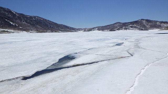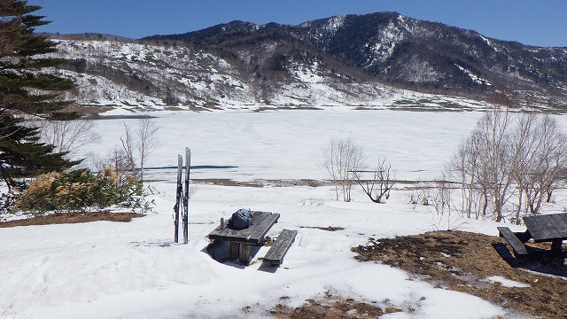 ここからようやく雪原が野反湖に向かって気持ちよさそうに広がっています。まだ雪の下にあるテンバのお花畑に寄り道しながら湖畔まで一気に滑ることが出来ました。