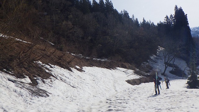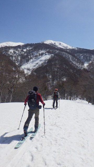ただ沢へと続く斜面は雪解けが進んで、流れや藪が出はじめていました。登ってきた尾根ルートを忠実に滑って下山することにします。