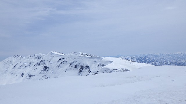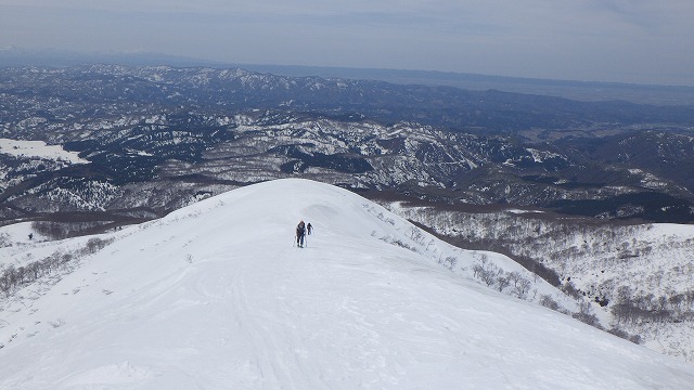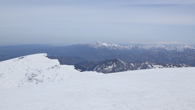 午前11時半、約4時間で標高1000mをハイクアップして山頂とうちゃこです。雪庇崩壊が怖いので、向こう側の景色をもっと見てみたくなりますが思いとどまります。それでも360度遮るものがない山頂からは、越後平野から遠く日本海も見渡せるようで最高の気分です。