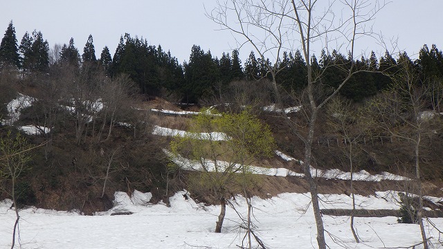 途中ブナの冬芽が膨らんでいるのに気付きました。残雪に映えるブナの新緑の頃の、美しい森の風景が想像できます。