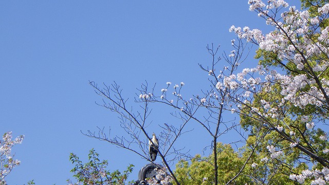 うれしいことに、まだサクラの花が楽しめました。屋根瓦にシラサギが留まっています。近くでボランティアツアーのガイドをしている方から、珍しい光景だと説明している声が聞こえきます。